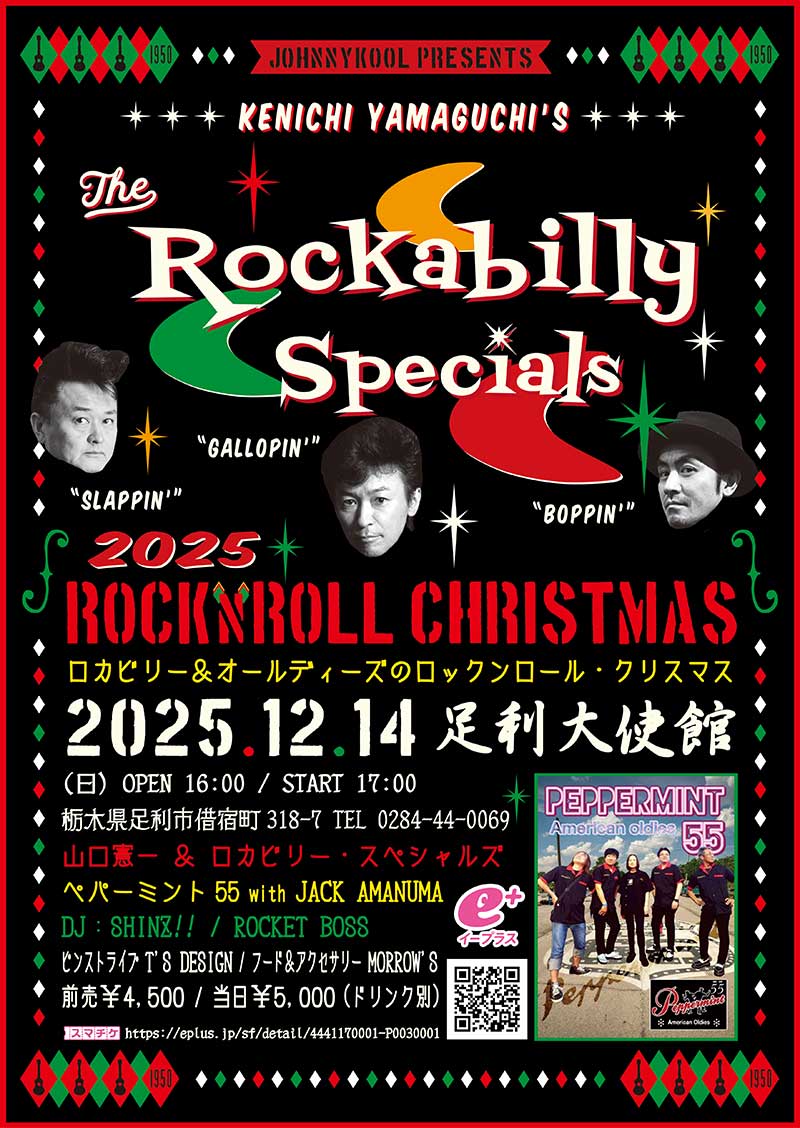![]() 「ロックンロール・クリスマス・スペシャル」 日時:2025年12月14日(日)OPEN 16:00 / START 17:00 会場:足利「足利ライブハウス大使館」栃木県足利市借宿町318-7 TEL 0284-44-0069 チケット料金:前売¥4,500(ドリンク別) / 当日¥5,000(ドリンク別)*中学生以下入場無料 出演:山口憲一 & ロカビリー・スペシャルズ / ペパーミント55 with JACK AMANUMA DJ:SHINZ!! / ROCKET BOSS ピンストライプ:T'S DESIGN フード&アクセサリー:MORROW'S チケット購入:https://eplus.jp/sf/detail/4441170001-P0030001 (注)チケット受付開始日:11月25日(火)10時から チケット予約: ジョニークール ticket@johnnykool.com(氏名、人数必須) NOB biarritzslappinboy@yahoo.co.jp JACK AMANUMA rocka.hula@docomo.ne.jp 足利ライブハウス大使館 TEL 0284-44-0069 info@live-taishikan.com 足利ミラクルウーマン TEL 0284-41-6647 ashimira@little-don.com |