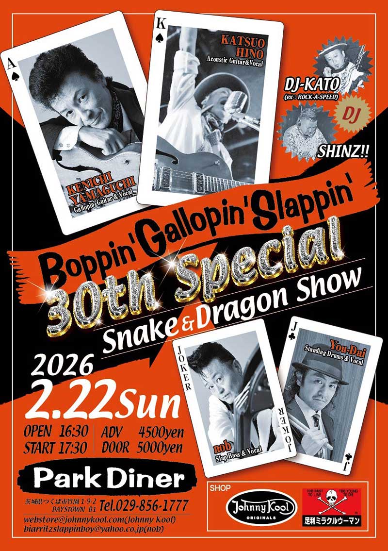 ![]() 「BOPPIN' GALLOPIN' SLAPPIN' 30TH SPECIAL / SNAKE & DRAGON SHOW」 日時:2026年2月22日(日)OPEN 16:30 / START 17:30 会場:つくば「PARK DINER」茨城県つくば市竹園1丁目9-2 DAYZTOWN B1 TEL 029-856-1777 チケット料金:前売¥4,500 当日¥5,000 出演:スネーク&ドラゴン・ショー DJ:DJ-KATO (ex. ROCK-A-SPEED) / SHINZ!! INFO:PARK DINER 029-856-1777 NOB biarritzslappinboy@yahoo.co.jp 前売予約:ジョニークール ticket@johnnykool.com(氏名、人数必須) |