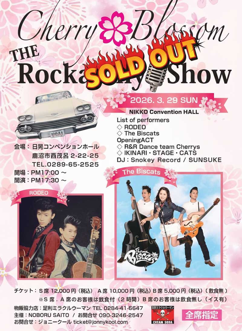 ![]() 「CHERRY BLOSSOM THE ROCKABILLY SHOW」 日時:2026年3月29日(日)OPEN 17:00 / START 17:30 会場:鹿沼「日晃コンベンションホール」栃木県鹿沼市西茂呂2丁目22-25 TEL 0289-65-2525 出演:RODEO / The Biscats / IKINARI STAGE CATS / R&R Dance team Cherrys DJ:Snokey Record / SUNSUKE 物販協力店:足利ミラクルウーマン TEL 0284-41-6647 主催:NOBORU SAITO / お問合せ 090-3246-2547 |